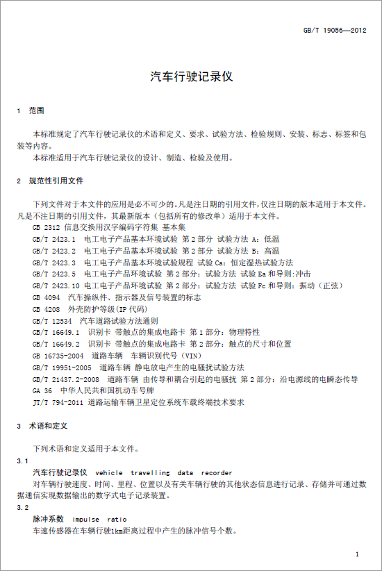 本标准规定了汽车行驶记录仪的术语和定义、要求、试验方法、检验规则、安装、标志、标签和包装等内容。