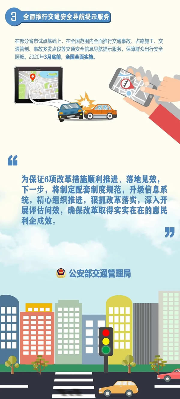 在部分省市试点基础上,在全国范围内全面推行交通安全导航提示服务,对交通事故、占掘路施工、交通管制、公路事故多发点段等情况,通过地图导航向交通参与者发布交通安全预警提示信息,保障群众出行安全顺畅。2020年3月底前,全国全面实施。